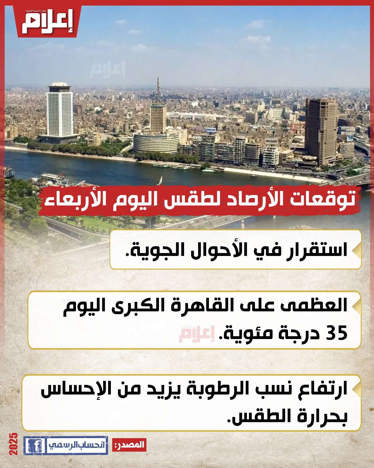 ولفتت إلى أن درجة الحرارة العظمى على القاهرة الكبرى اليوم ٣٥ درجة مئوية.