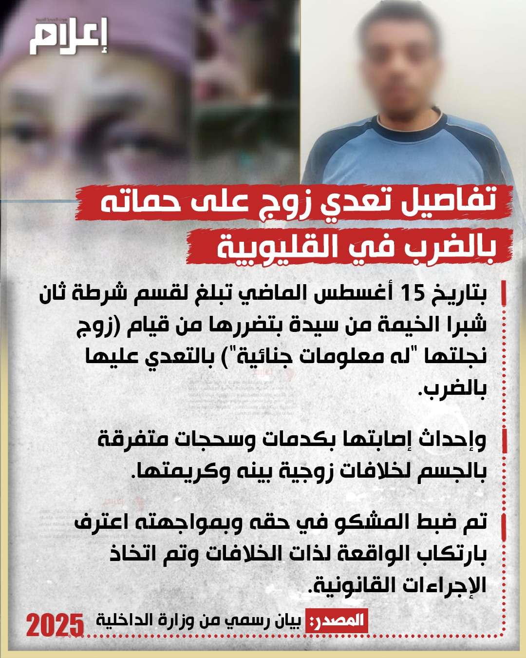 بالفحص تبين أنه بتاريخ 15 أغسطس الماضى تبلغ لقسم شرطة ثان شبرا الخيمة من والدة القائمة بالنشر (ربة منزل – مقيمة بدائرة القسم) بتضررها من قيام (زوج نجلتها "له معلومات جنائية"– مقيم بذات الدائرة) بالتعدي عليها بالضرب وإحداث إصابتها بكدمات وسحجات متفرقة بالجسم لخلافات زوجية بينه وكريمتها.