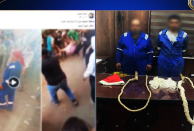 بالفحص أمكن تحديد وضبط الشخصين الظاهرين بمقطعي الفيديو (مقيمان بنطاق محافظتي القاهرة والمنوفية) وبحوزتهما (سوطان).