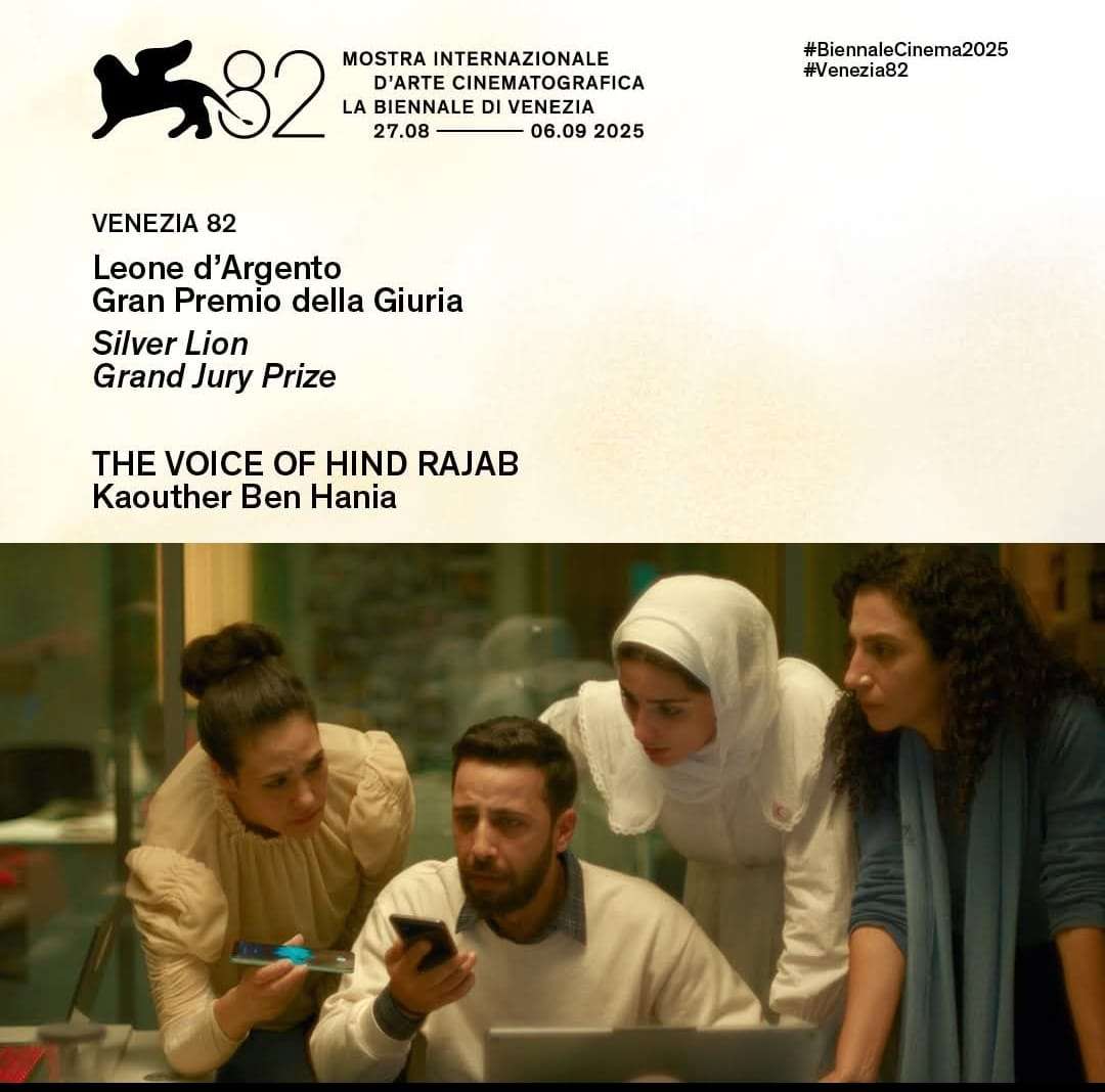 فاز منذ قليل، فيلم "صوت هند رجب" للمخرجة التونسية كوثر بن هنية بجائزة "الأسد الفضي" بمسابقة لجنة التحكيم الكبرى (Grand Jury Prize) في ختام الدورة 82 لمهرجان فينيسيا السينمائي الدولي.