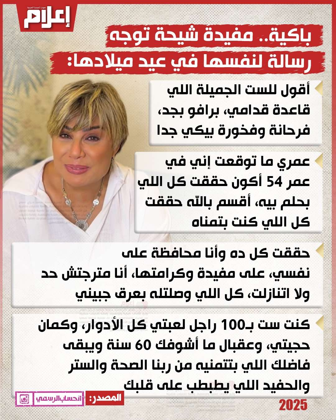احتفلت الإعلامية مفيدة شيحة بعيد ميلادها الرابع والخمسين، ووجهت لنفسها رسالة مؤثرة، عبرت فيها عن فخرها بما حققته خلال مشوار حياتها.