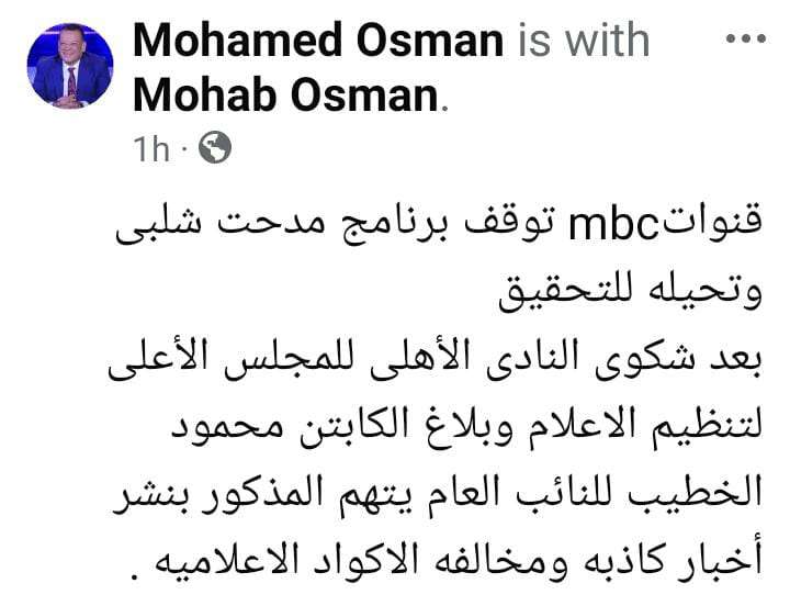 نشر "عثمان" عبر حسابه الشخصي على موقع التواصل الاجتماعي فيس بوك، وكتب: "قنوات mbc توقف برنامج مدحت شلبي وتحيله للتحقيق".