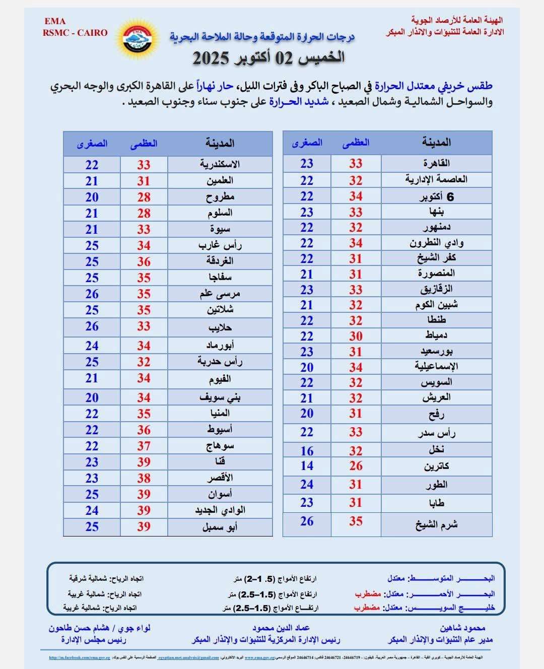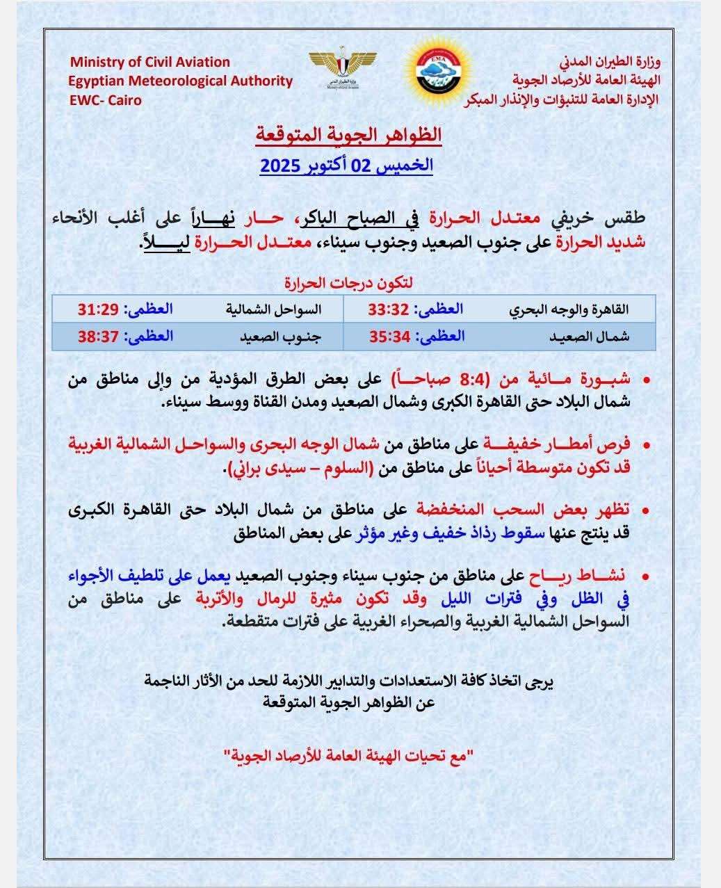أصدرت "الأرصاد" بيانًا رسميًا عبر صفحتها الرسمية على موقع التواصل الاجتماعي "فيس بوك"، بدرجات الحرارة والظواهر الجوية المتوقعة لغدٍ الخميس، مشيرة إلى أنه سيكون طقس خريفي معتدل الحرارة في الصباح الباكر، حار نهارًا على أغلب الأنحاء، شديد الحرارة على جنوب الصعيد وجنوب سيناء، معتدل الحرارة ليلًا.