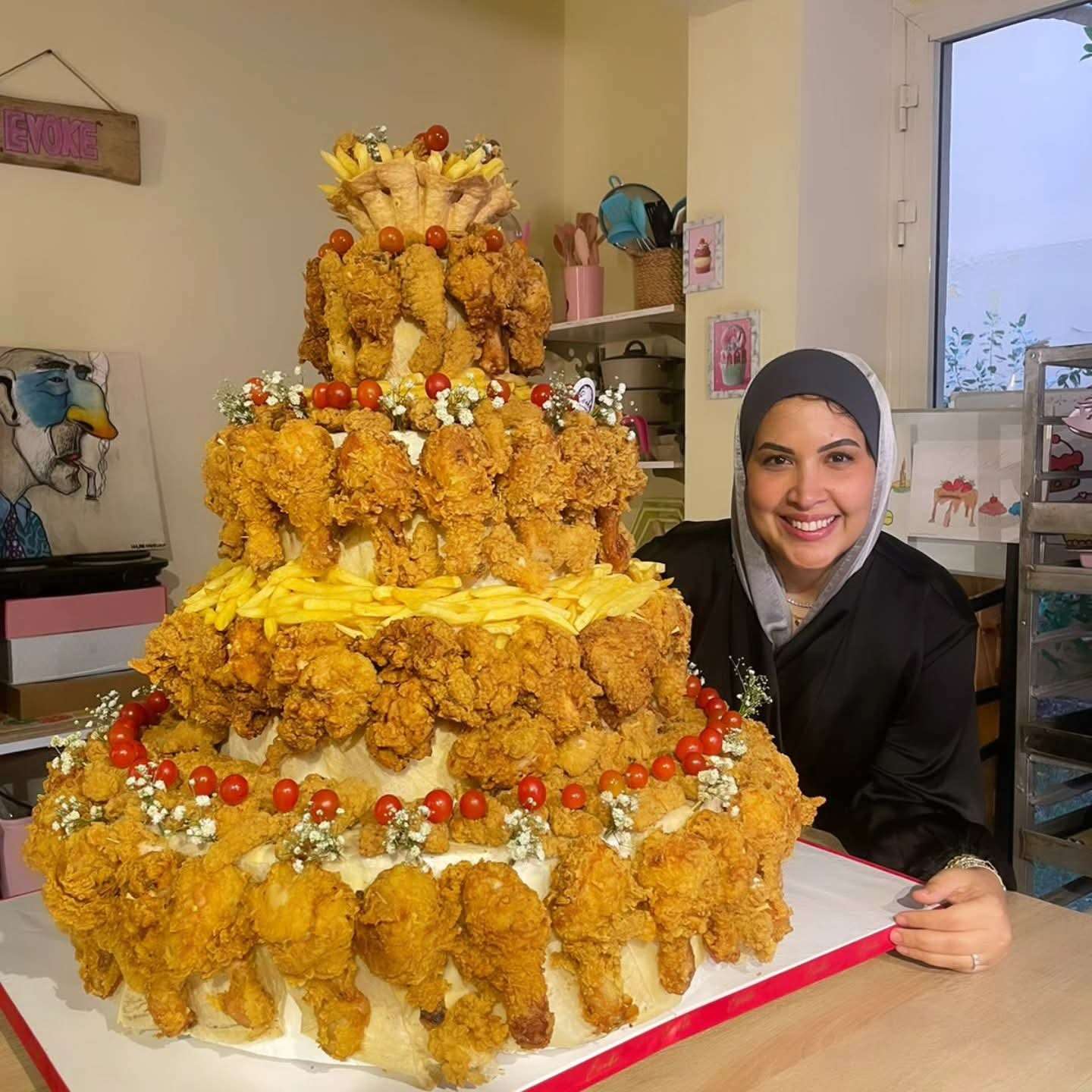 تابعت: "التورتة كلها مصنوعة من قطع دجاج حقيقية مزينة بالخس وطماطم شيري صغيرة."