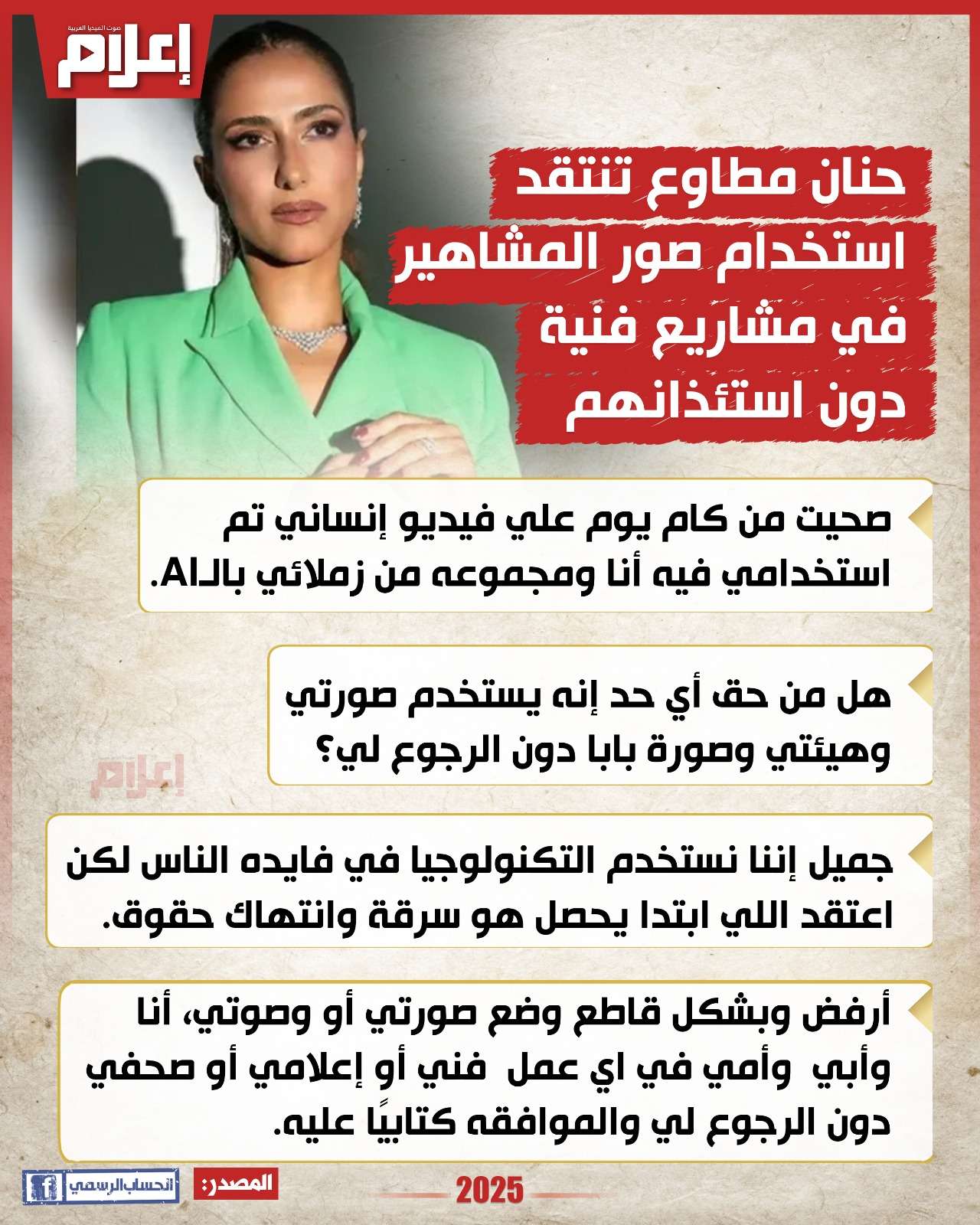 أعربت الفنانة حنان مطاوع عن استيائها من ظهورها في فيديو مؤثر جرى تداوله مؤخرًا عبر منصات التواصل الاجتماعي، تم فيه استخدام صورتها وهيئتها إلى جانب صور لوالدها الراحل، وعدد من زملائها وذويهم المتوفين، من خلال تقنية الذكاء الاصطناعي (AI) دون علمها أو موافقتها.