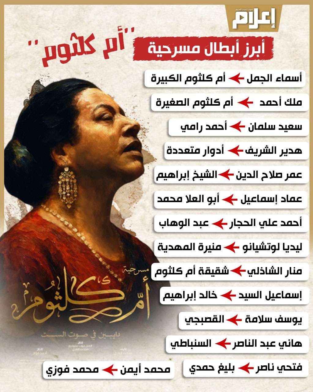 وفيما يلي قائمة بأسماء أبطال مسرحية "أم كلثوم":