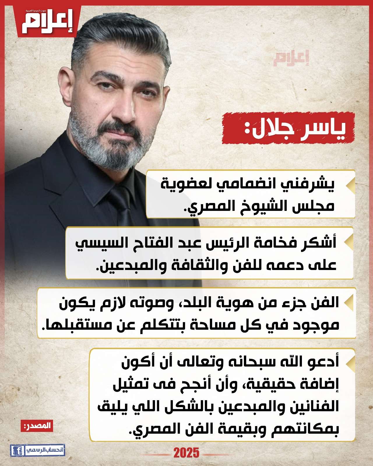 كتب "جلال" عبر حسابه الرسمي على موقع التواصل الاجتماعي "فيس بوك": "الحمد لله.. يشرفني انضمامي لعضوية مجلس الشيوخ المصري"