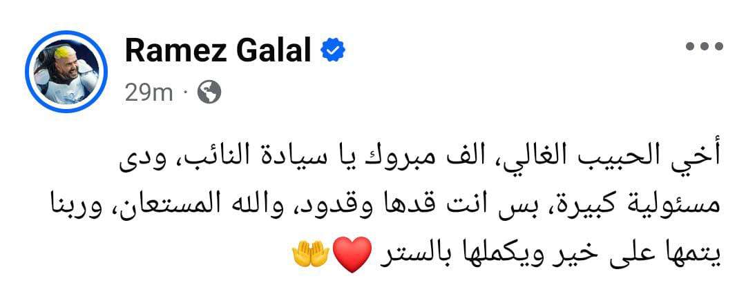 وجه الفنان رامز جلال رسالة دعم وتهنئة لشقيقه الأكبر الفنان ياسر جلال، وذلك بعد تعيين الأخير في مجلس الشيوخ بقرار من رئيس الجمهورية.