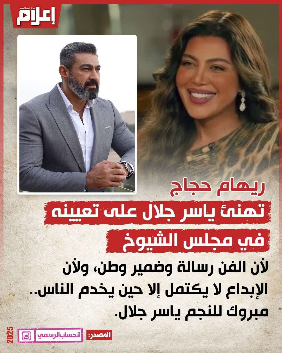 هنأت الفنانة ريهام حجاج الفنان ياسر جلال، بعد صدور قرار تعيينه في مجلس الشيوخ، معبرة عن سعادتها بهذا القرار.