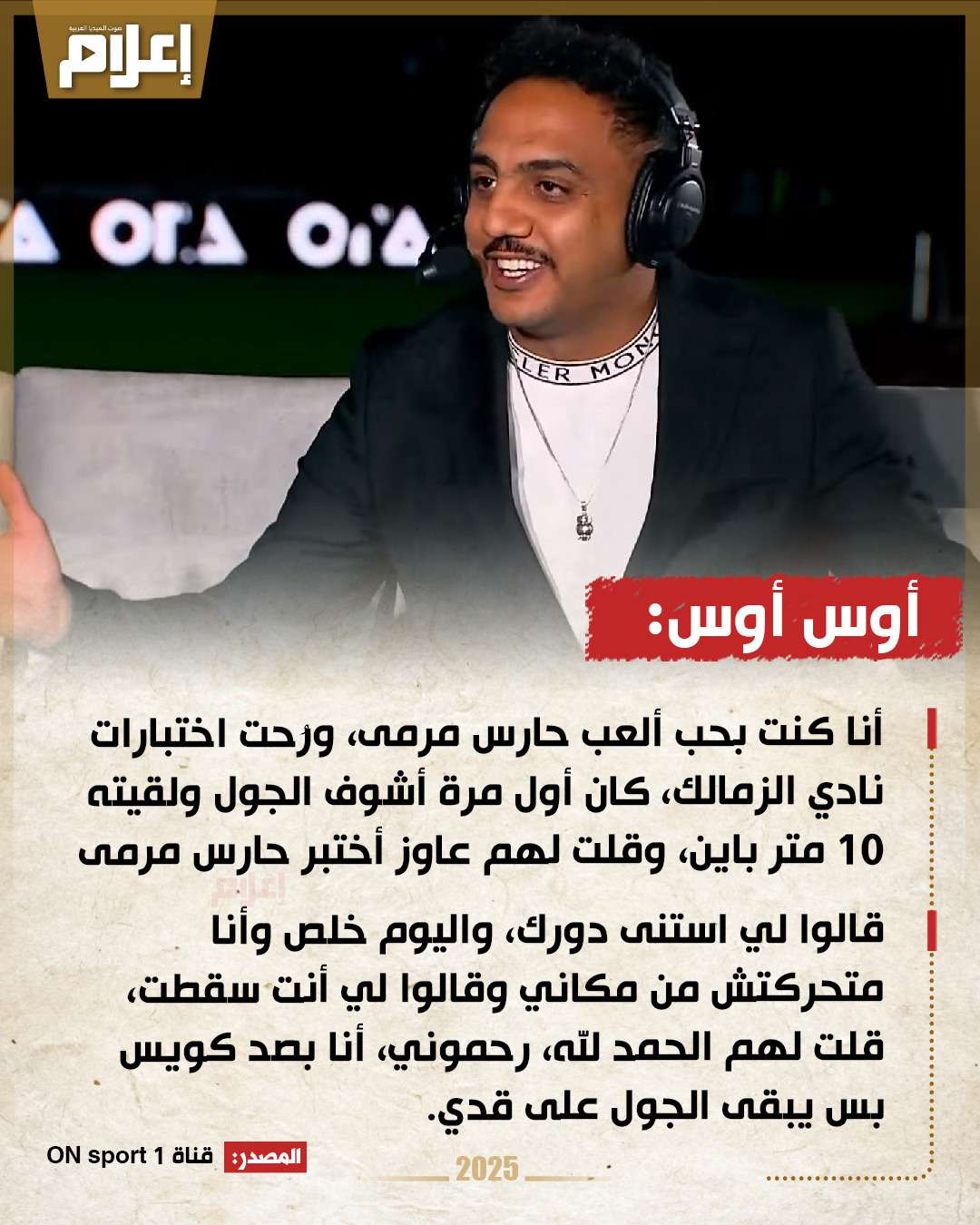 قال أوس أوس خلال لقائه على قناة "ON sport 1": "أنا كنت بحب ألعب حارس مرمى، ورُحت اختبارات نادي الزمالك، كان أول مرة أشوف الجول ولقيته 10 متر باين، وقلت لهم عاوز أختبر حارس مرمى".