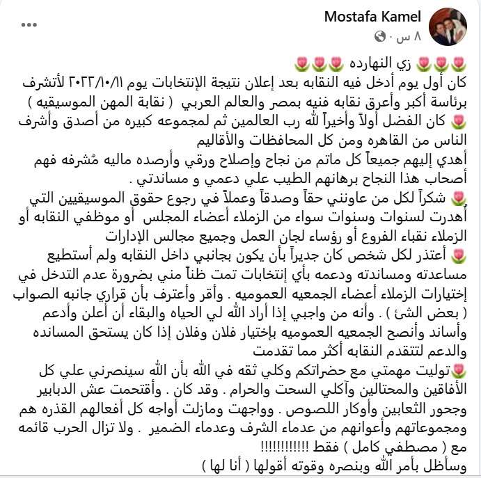 استعاد الفنان مصطفى كامل نقيب المهن الموسيقية، ذكريات توليه رئاسة النقابة قبل ثلاث سنوات، حيث كتب منشورًا عبّر فيه عن امتنانه لجميع من دعموه في الانتخابات التي جرت في 11 أكتوبر 2022، مؤكدًا أنه "يتشرف برئاسة أكبر وأعرق نقابة فنية في مصر والعالم العربي".