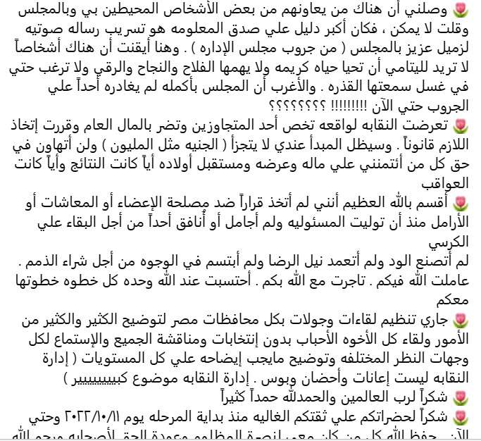 أضاف: "أعتذر لكل شخص كان جديرًا بأن يكون بجانبي داخل النقابة ولم أستطع مساعدته أو مساندته أو دعمه في أي انتخابات سابقة، ظنًا مني بضرورة عدم التدخل في اختيارات الزملاء أعضاء الجمعية العمومية.. وأُقر وأعترف بأن قراري جانب الصواب (بعض الشيء)، وأنه من واجبي — إذا أراد الله لي الحياة والبقاء — أن أعلن وأدعم وأساند وأنصح الجمعية العمومية باختيار من يستحق الدعم والمساندة، لتتقدم النقابة أكثر مما تقدمت".