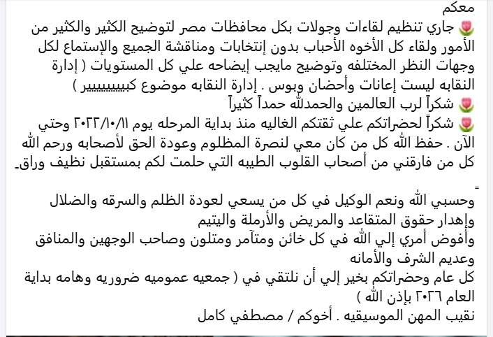 وأعرب نقيب الموسيقيين عن شكره لكل من تعاون معه من أعضاء المجلس وموظفي النقابة ونقباء الفروع ورؤساء لجان العمل، في سبيل "استعادة حقوق الموسيقيين التي أُهدرت لسنوات". كما وجّه اعتذارًا لكل من لم يتمكن من دعمه أو مساعدته، مؤكدًا أنه أخطأ حين امتنع عن إعلان مساندته لبعض المرشحين في الانتخابات السابقة، وأنه سيتبنى موقفًا أكثر وضوحًا مستقبلاً دعمًا لمصلحة النقابة.
