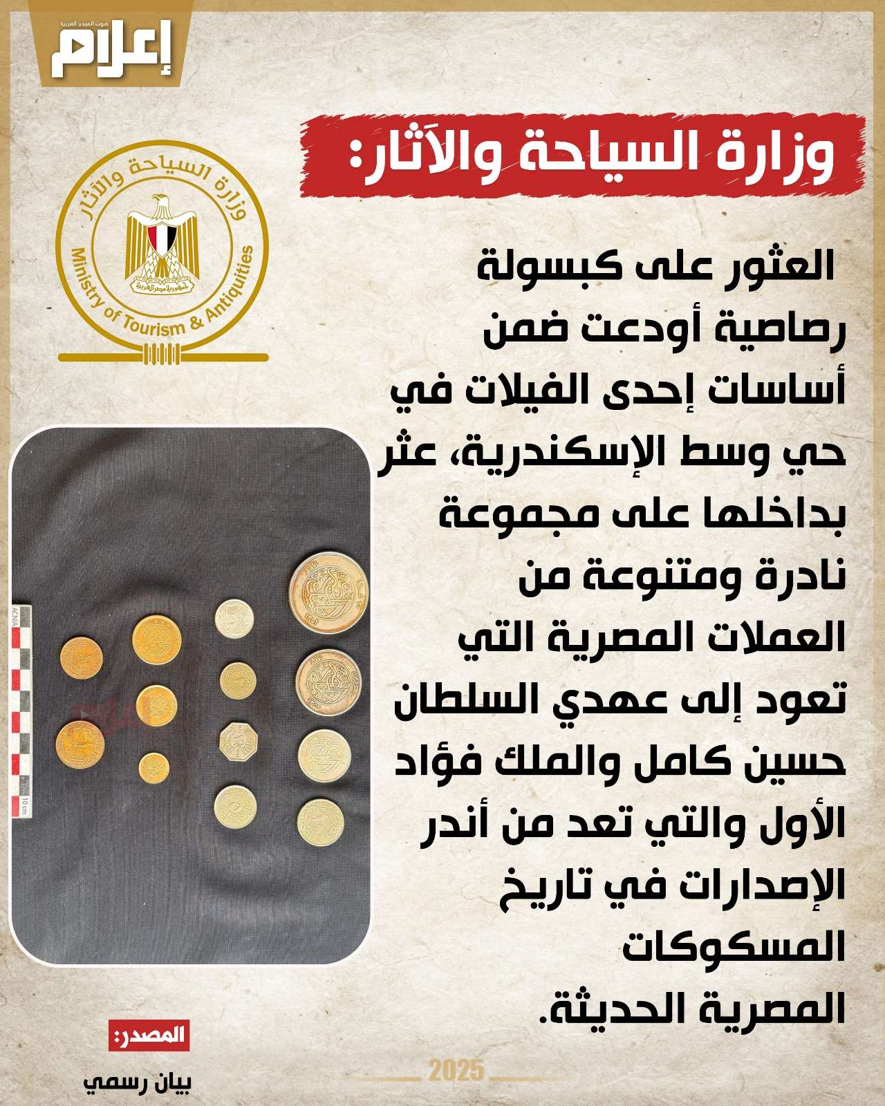 في إطار أعمال حفائر الإنقاذ التي يُجريها المجلس الأعلى للآثار في حي وسط الإسكندرية، تم العثور على كبسولة رصاصية أودعت ضمن أساسات إحدى الفيلات، عثر بداخلها على مجموعة نادرة ومتنوعة من العملات المصرية التي تعود إلى عهدي السلطان حسين كامل والملك فؤاد الأول.