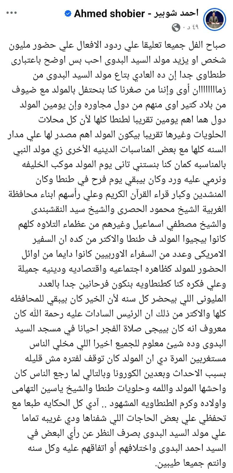 قال "شوبير" في منشور له عبر موقع التواصل الاجتماعي "فيس بوك": "باعتباري طنطاوي جدًا، ده العادي بتاع مولد السيد البدوي من زمان، ومن صغرنا كنا بنحتفل بالمولد مع ضيوف من بلاد كثيرة، منهم من دول مجاورة، ويومي المولد هما الأهم تقريبًا في طنطا كلها، لأن المولد بيكون مصدر رزق رئيسي لمحلات الحلويات وغيرها على مدار السنة".