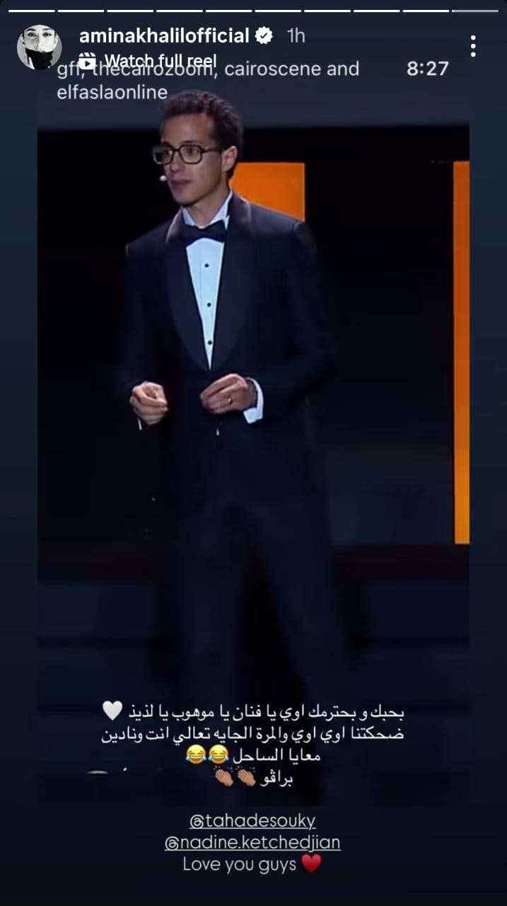نشرت "خليل" من خلال خاصية القصة القصيرة "ستوري" عبر حسابها الرسمي على موقع التواصل الاجتماعي وتبادل الصور والفيديوهات "إنستجرام"، مقطع الفيديو الخاص بالفقرة الكوميدية التي قدمها الفنان طه دسوقي خلال حفل افتتاح مهرجان الجونة السينمائي في دورته الثامنة.