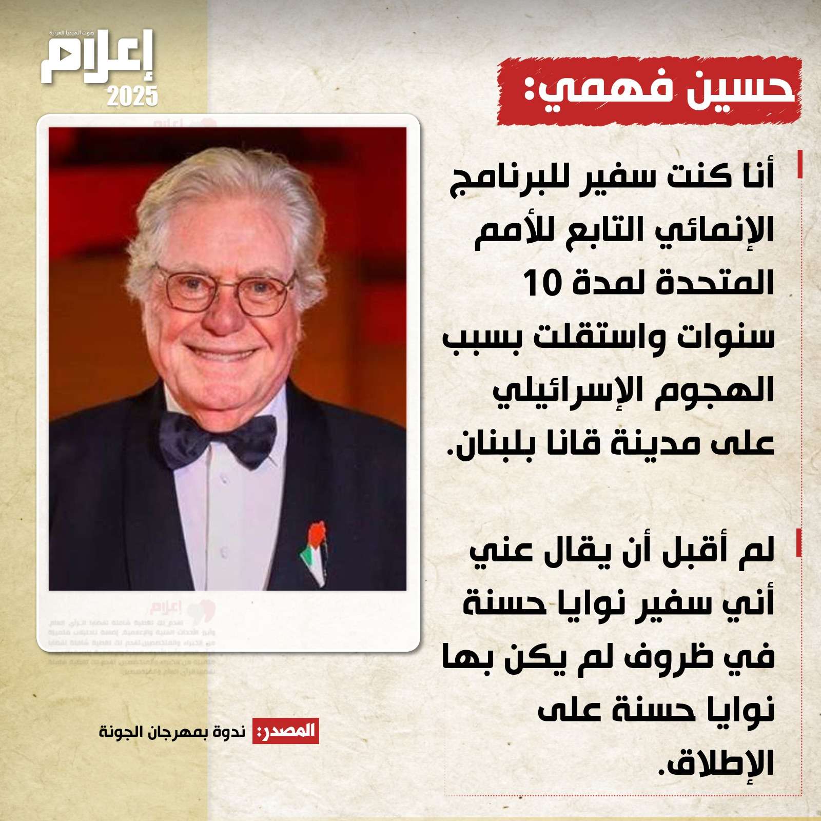قال "فهمي" خلال ندوة على هامش فعاليات مهرجان الجونة السينمائي في دورته الثامنة: "أنا كنت سفير للبرنامج الإنمائي التابع للأمم المتحدة لمدة 10 سنوات واستقلت بسبب الهجوم الإسرائيلي على مدينة قانا بلبنان".