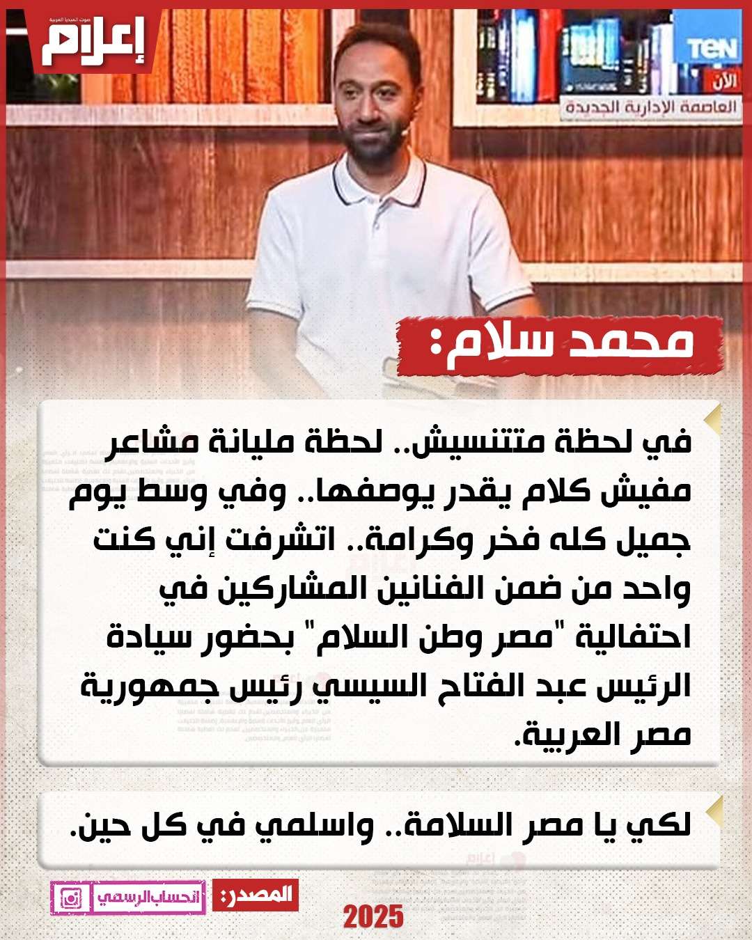 تابع: "اتشرفت إني كنت واحد من ضمن الفنانين المشاركين في احتفالية "مصر وطن السلام" بحضور سيادة الرئيس عبد الفتاح السيسي رئيس جمهورية مصر العربية.. لكي يا مصر السلامة.. واسلمي في كل حين".