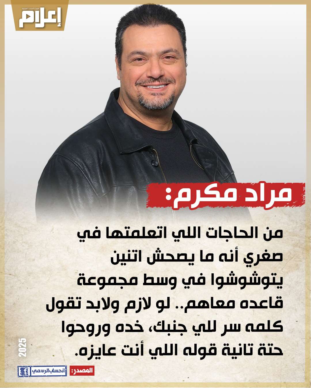 تحدث الفنان مراد مكرم عن واحدة من القيم والأخلاقيات التي نشأ عليها منذ الصغر، ناصحًا جمهوره ومتابعيه بالعمل بها في حياتهم اليومية.