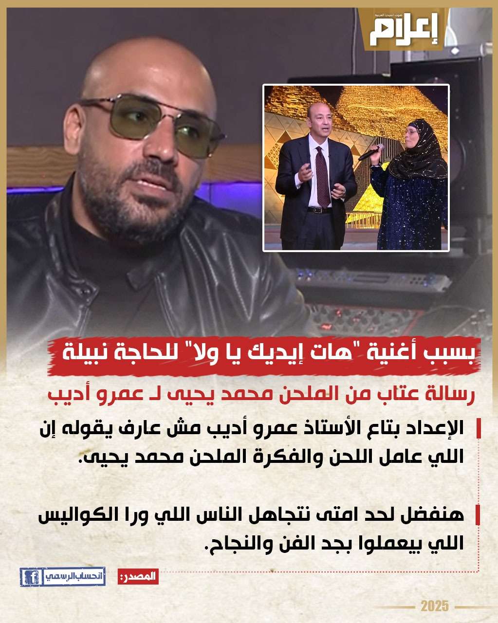 وجه الملحن محمد يحيى، رسالة عتاب للإعلامي عمرو أديب، بسبب حديثه مع الحاجة نبيلة، صاحبة أغنية"هات إيديك يا ولا"، وذلك خلال لقائها معه في حلقة مساء أمس الإثنين، من برنامج "الحكاية" المذاع عبر شاشة mbc مصر.