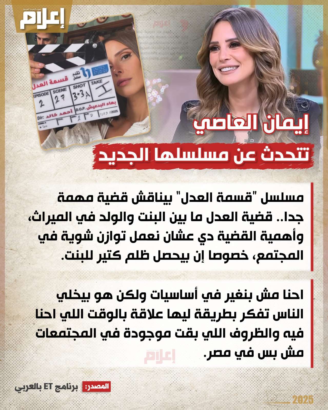 مسلسل "قسمة العدل" من بطولة الفنان إيمان العاصي، ويشاركها البطولة وأحمد تمام، وعدد من الفنانين، وهو من تأليف أمين جمال، وإخراج أحمد خالد، ويتناول قضية اجتماعية هامة، وتدور أحداثه في إطار من الإثارة والتشويق.