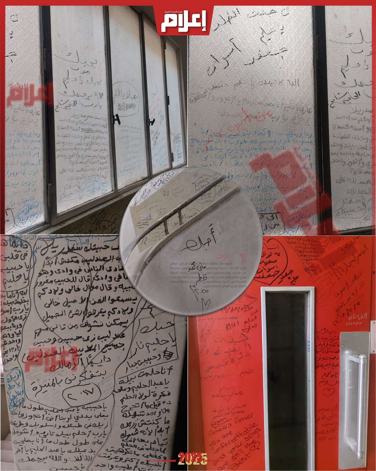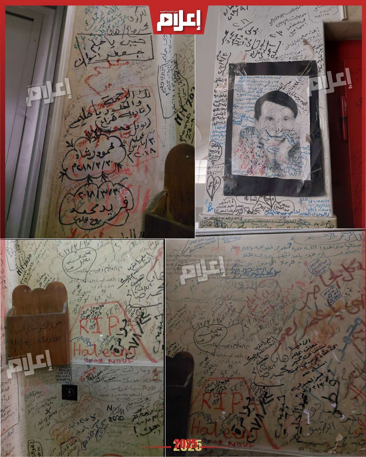 - في الطابق الذي تقع فيه شقة الفنان الراحل، تستقبلك الجدران المليئة بتواقيع ومعايدات معجبي العندليب، إذ غطّت الإمضاءات جدران المكان بالكامل، تحمل بين سطورها إهداءات ورسائل محبة من مصر ومختلف الدول العربية تعبّر عن عشق أصحابها لـعبد الحليم حافظ.