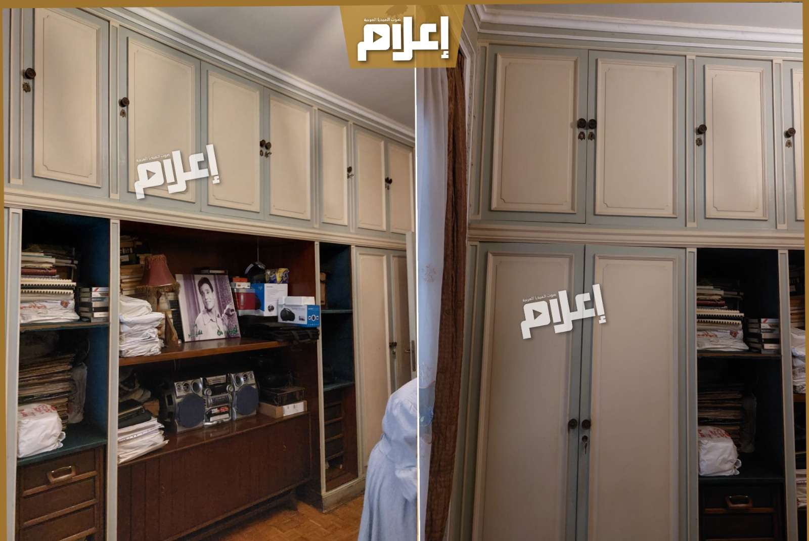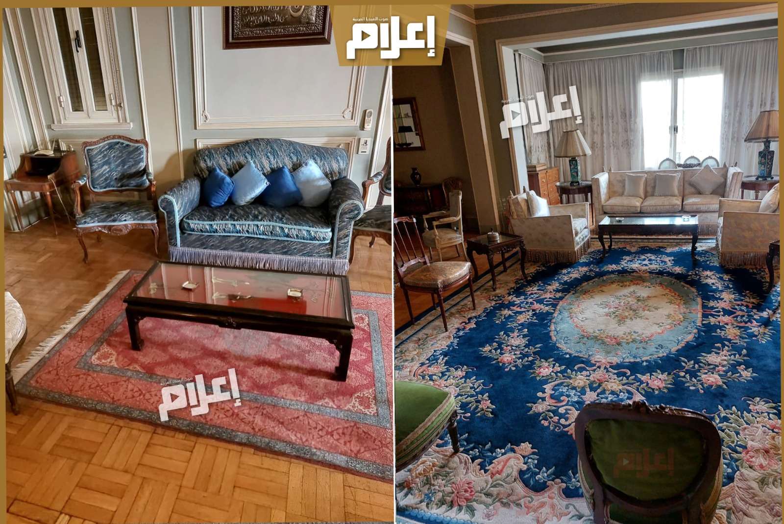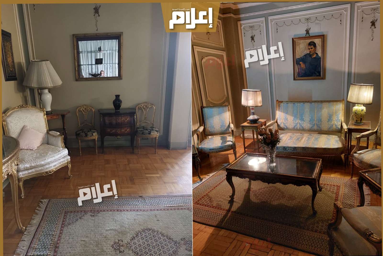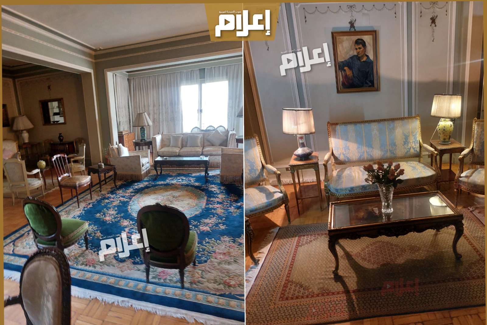 - في مدخل الشقة تستقبلك صورة كبيرة للعندليب، ثم تنتقل إلى غرفة الاستقبال التي تضم أربع زوايا مختلفة للجلوس، تحتوي على أكثر من صالون بتصميمات وديكورات متنوعة، تبدو في جمالها وكأنها أنتيكات قادمة من زمنٍ مضى بكل ما تحمله الكلمة من معنى.