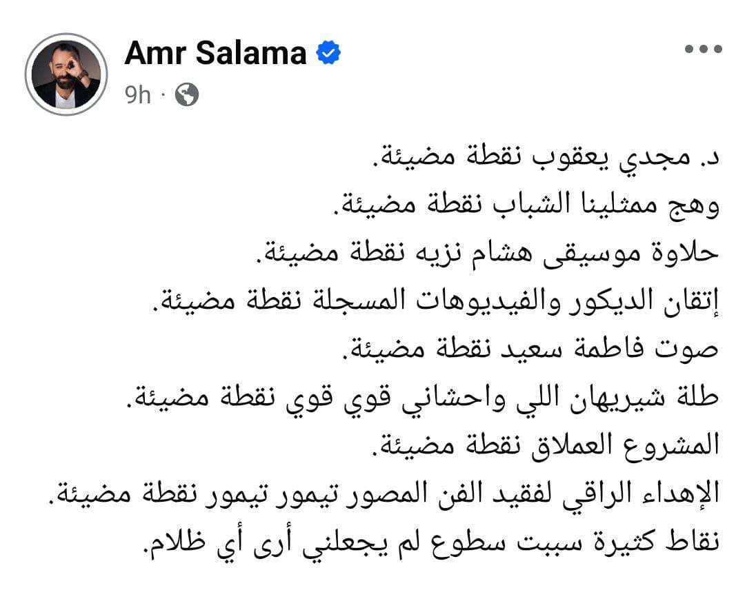كتب "سلامة" عبر حسابه الرسمي على موقع التواصل الاجتماعي "فيس بوك": "دكتور مجدي يعقوب نقطة مضيئة. وهج ممثلينا الشباب نقطة مضيئة. حلاوة موسيقى هشام نزيه نقطة مضيئة"