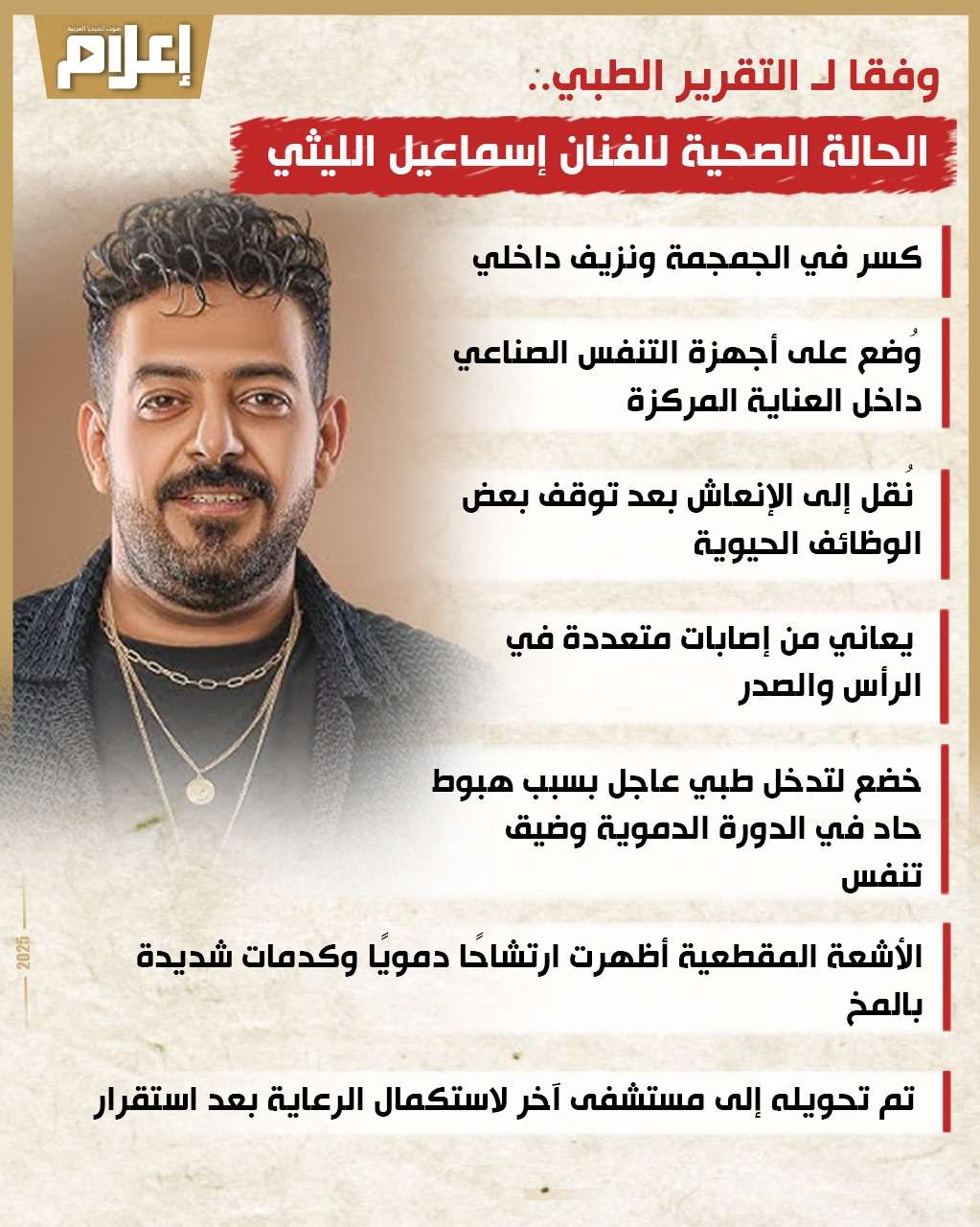 تعرض المطرب الشعبي إسماعيل الليثي لحادث سير قوي، أسفر عن إصابته بإصابات بالغة نُقل على إثرها إلى المستشفى في حالة حرجة، حيث يرقد حاليًا داخل العناية المركزة تحت إشراف طبي مكثف.