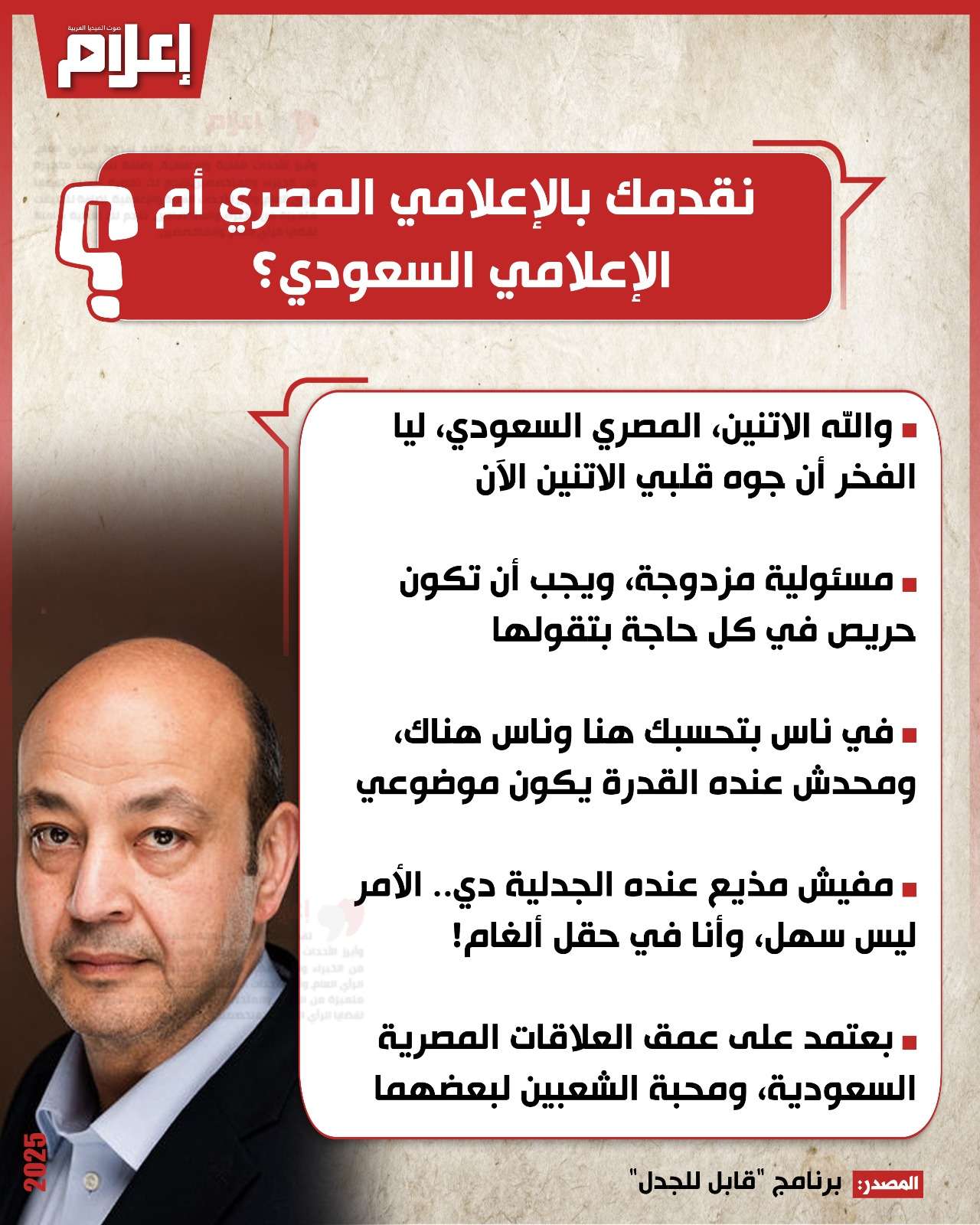 تحدث الإعلامي عمرو أديب عن صعوبة كونه إعلاميًا مصريًا سعوديًا، على حد وصفه، مشيرًا إلى أنها مسؤولية مزدوجة تجبره على أن يكون حريصًا في كل كلمة يتفوه بها، وفي كل عمل يقوم به.