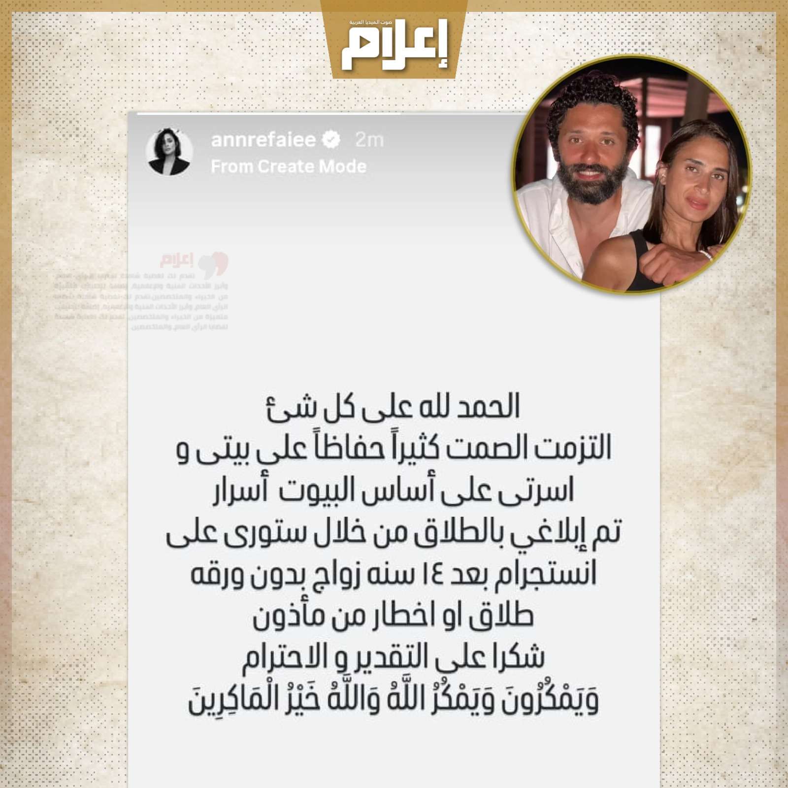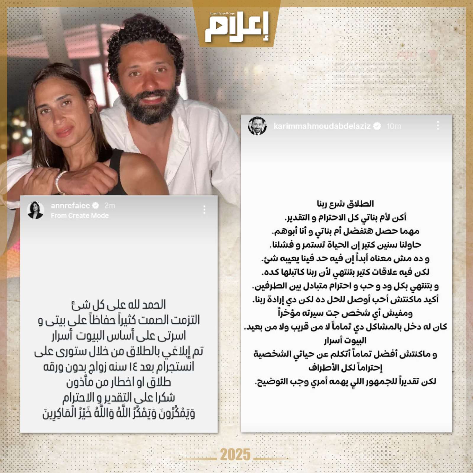 كان الفنان كريم محمود عبد العزيز ، قد أعلن منذ ساعات عن انفصاله عن آن الرفاعي، مشيرًا إلى أنهما حاولا الاستمرار كثيرًا، لكنهما فشلا، ولا علاقة لأي شخص بطلاقهما.
