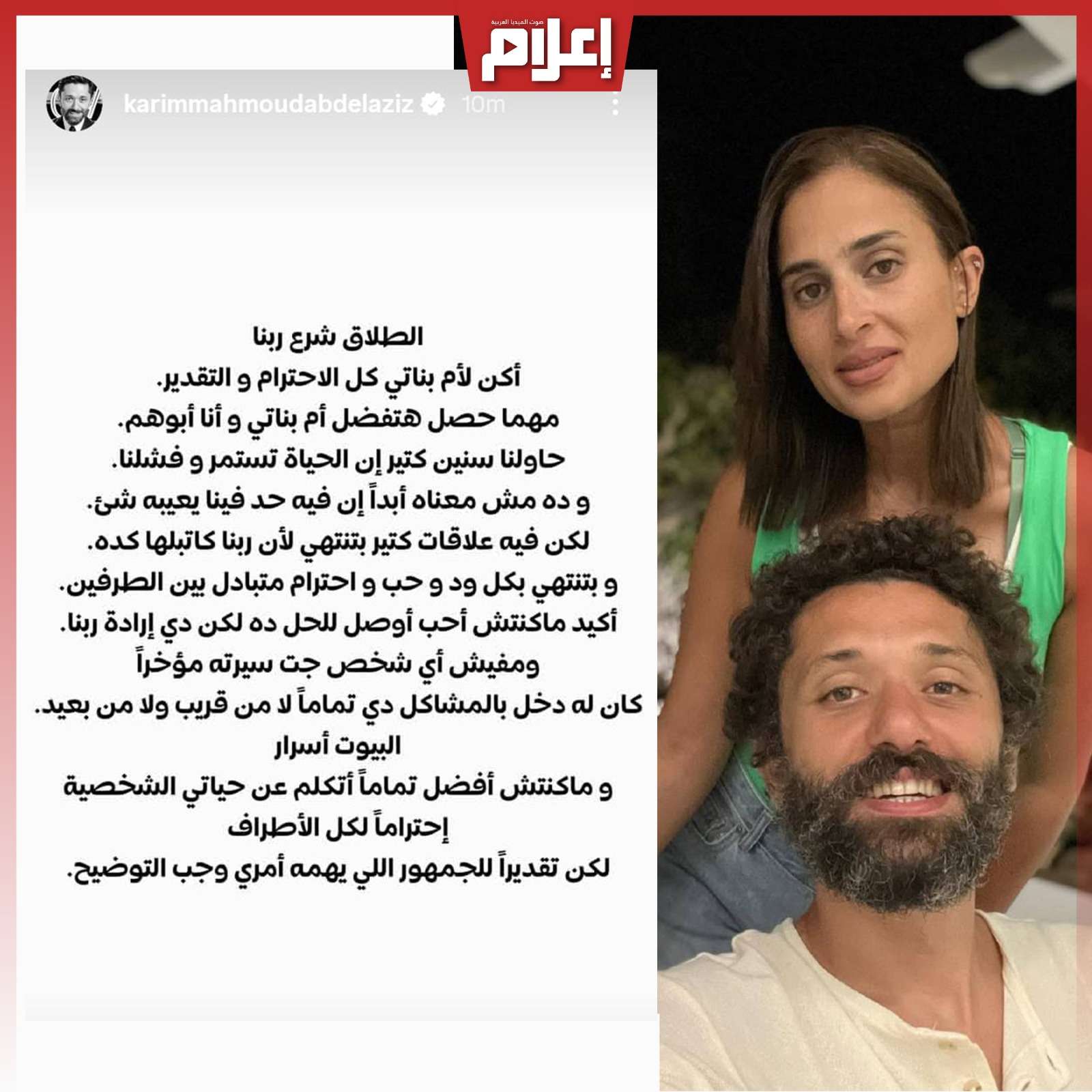 كتب "عبد العزيز" عبر حسابه الرسمي على موقع تبادل الصور والفيديوهات "إنستجرام": "الطلاق شرع ربنا، وأنا أكن لأم بناتي كل الاحترام والتقدير، ومهما حصل هتفضل أم بناتي و أنا أبوهم".
