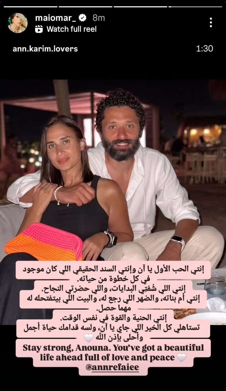 تابعت: "أنتي السند الحقيقي اللي كان موجود في كل خطوة من حياته، أنتي اللي شوفتي البدايات وحضرتي النجاح.. أنتي أم بناته والضهر اللي رجع له والبيت اللي بيتفتح له مهما حصل.. أنتي الحنية والقوة في نفس الوقت. تستاهلي كل الخير اللي جاي يا آن، ولسه قدامك حياة أجمل وأحلى بإذن الله.. ابقِ قوية، تنتظرك حياة مليئة بالحب والسلام".