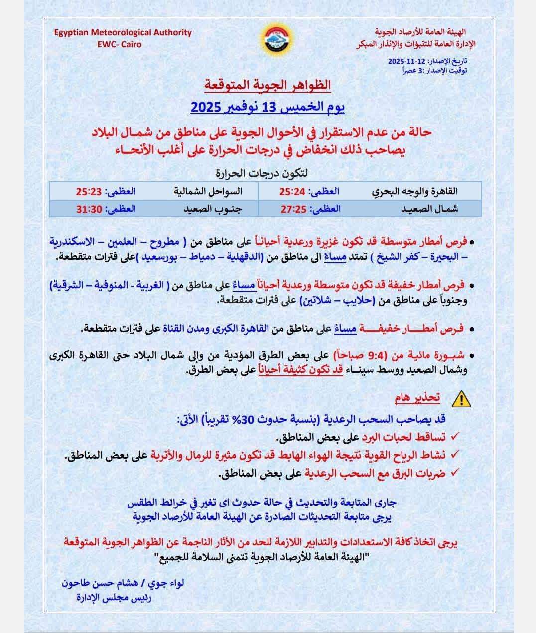 كشفت الهيئة العامة للأرصاد الجوية عن تفاصيل حالة الطقس ودرجات الحرارة المتوقعة غداً الخميس 13 نوفمبر 2025.
