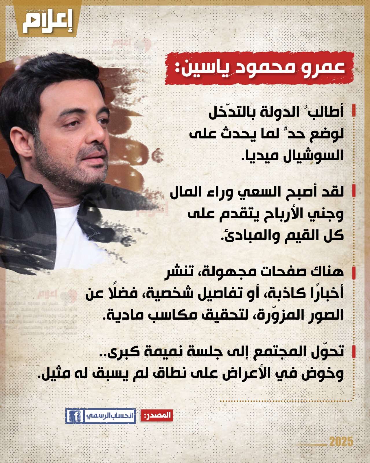 طالب السيناريست عمرو محمود ياسين، الدولة بالتدخل العاجل لوضع ضوابط ورقابة فعالة على ما يحدث على وسائل التواصل الاجتماعي، مؤكداً أن السعي وراء المال وجني الأرباح بات يتقدم على القيم والمبادئ.