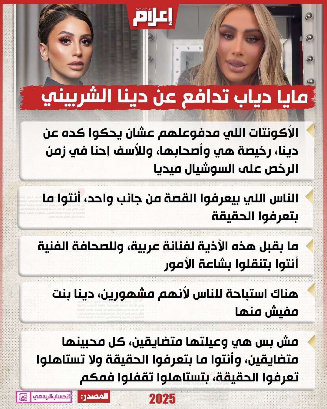 اختتمت مايا حديثها برسالة حادة: "كل ست أو رجل لازم يحط نفسه مكانها أو مكان أخت أو بنته.. اللي بيحصل استباحة علنية للناس لمجرد إنهم مشهورين.. دينا بنت طيبة، محترمة، وجدعة، وأنتوا ما بتعرفوا الحقيقة ولا تستاهلوا تعرفوا الحقيقة، بتستاهلوا تقفلوا فمكم".