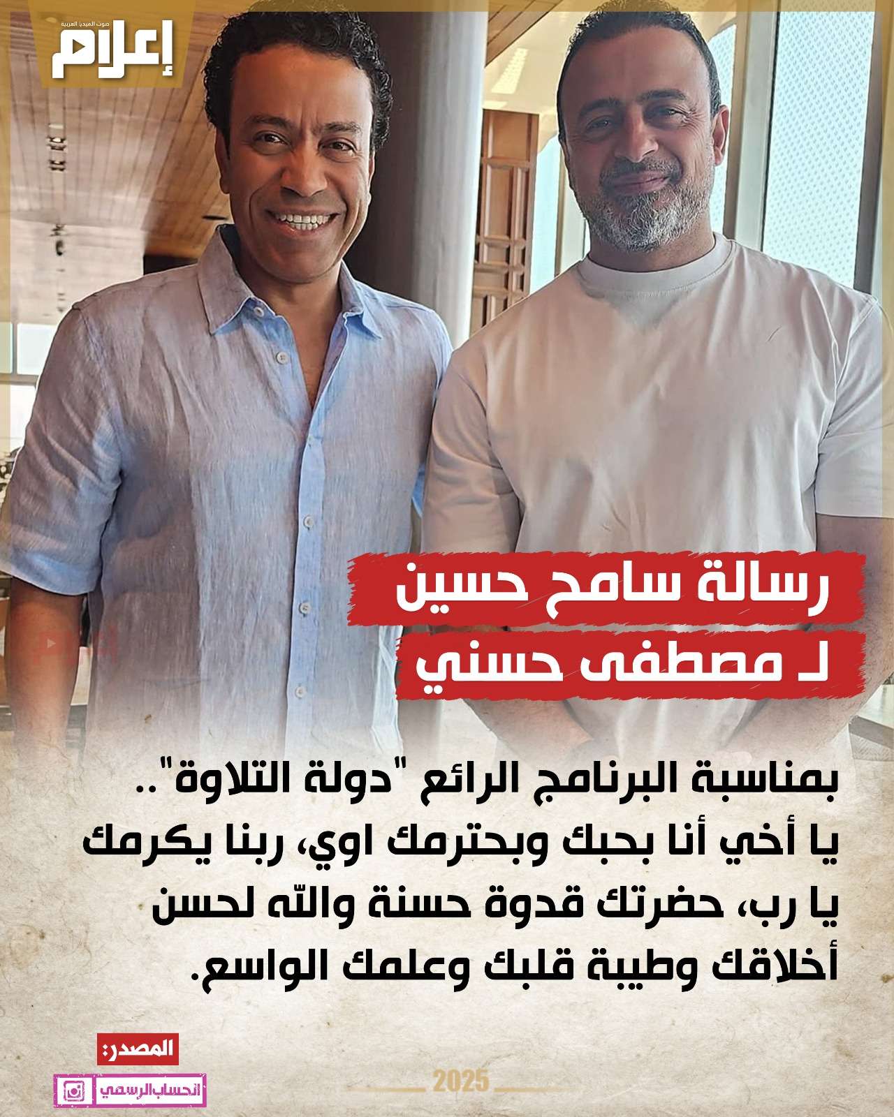 نشر "حسين" صورة تجمعه بالداعية مصطفى حسني عبر حسابه الرسمي على موقع التواصل الاجتماعي وتبادل الصور والفيديوهات "إنستجرام" وعلق: "بمناسبة البرنامج الرائع "دولة التلاوة".. يا أخي أنا بحبك وبحترمك اوي".