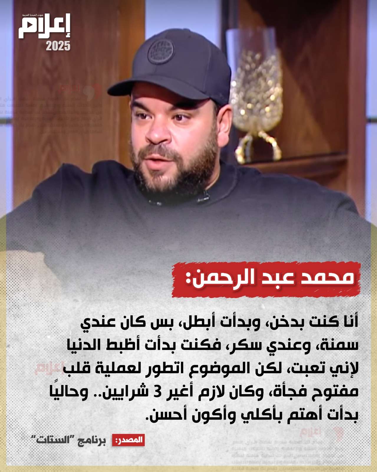 قال "عبد الرحمن" خلال استضافته في برنامج "الستات" المذاع عبر شاشة "النهار"، إنه كان مُدخنًا وحاول الإقلاع عن التدخين، فضلًا عن إصابته بمرض السكري ومعاناته للسمنة، وهو ما ساهم في تدهور حالته الصحية.