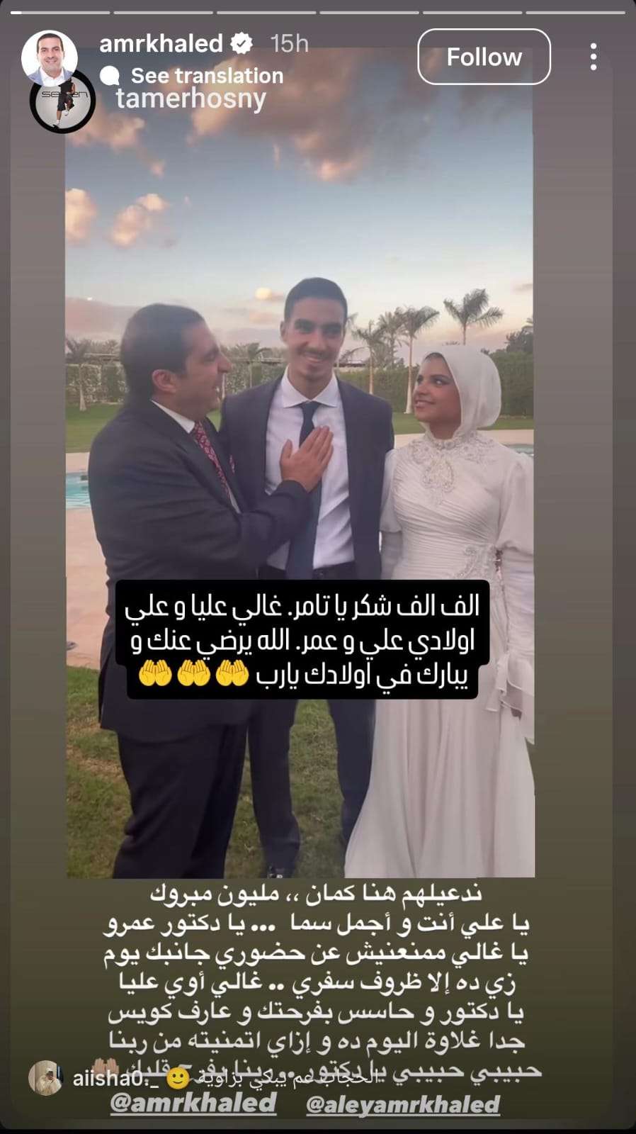 ومن جانبه، أعاد الداعية عمرو خالد نشر "ستوري" الفنان تامر حسني عبر حسابه على "إنستجرام" وعلق: "ألف ألف شكر يا تامر، غالي عليا وعلى أولادي علي وعمر.. الله يرضى عنك ويبارك في أولادك يا رب".