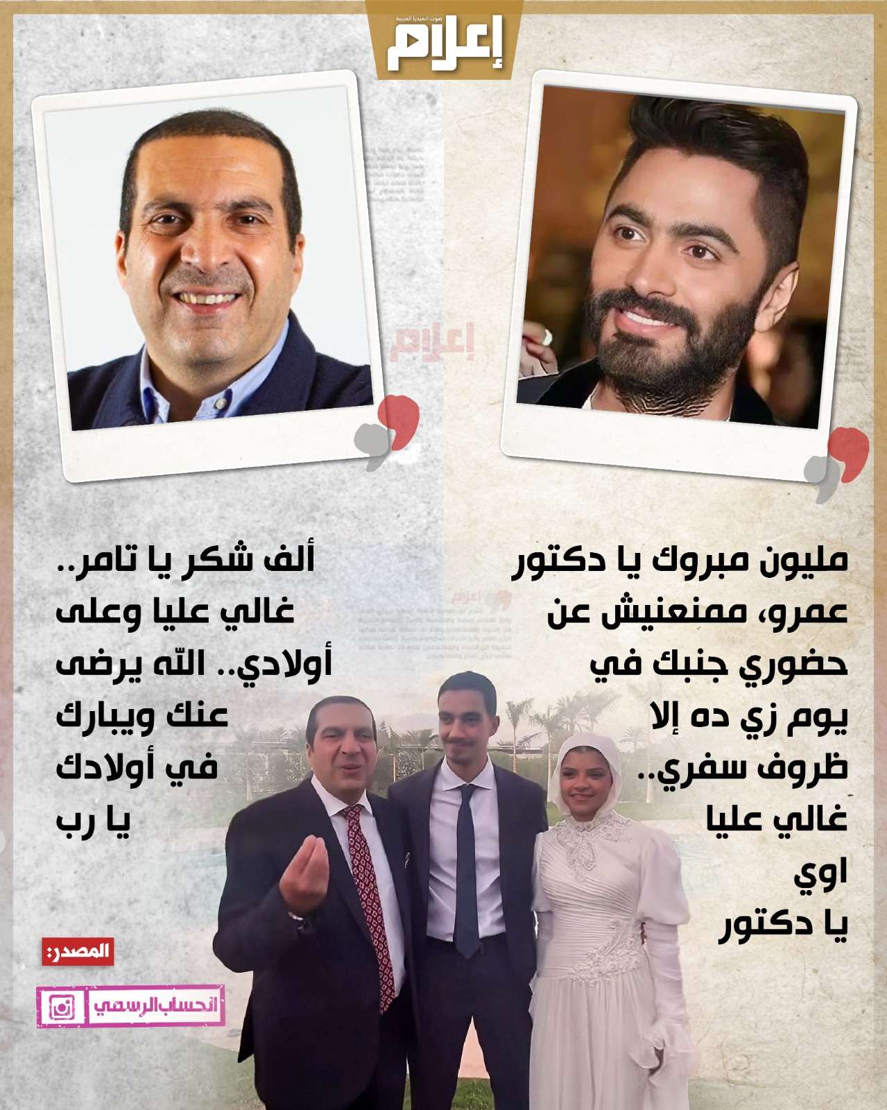 تابع: "يا دكتور عمرو يا غالي، ممنعنيش عن حضوري جنبك يوم زي ده إلا ظروف سفري.. غالي أوي عليا يا دكتور وحاسس بفرحتك، وعارف كويس جدًا غلاوة اليوم ده وإزاي اتمنيته من ربنا.. حبيبي يا دكتور ربنا يفرح قلبك".