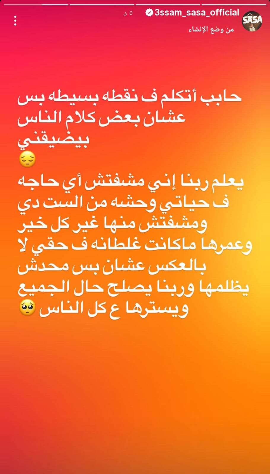 وعلق عصام صاصا قائلا: "حابب أتكلم ف نقطه بسيطه بس عشان بعض كلام الناس بيضيقني.. يعلم ربنا إني مشفتش أي حاجه ف حياتي وحشه من الست دي ومشفتش منها غير كل خير وعمرها ما كانت غلطانه في حقي".
