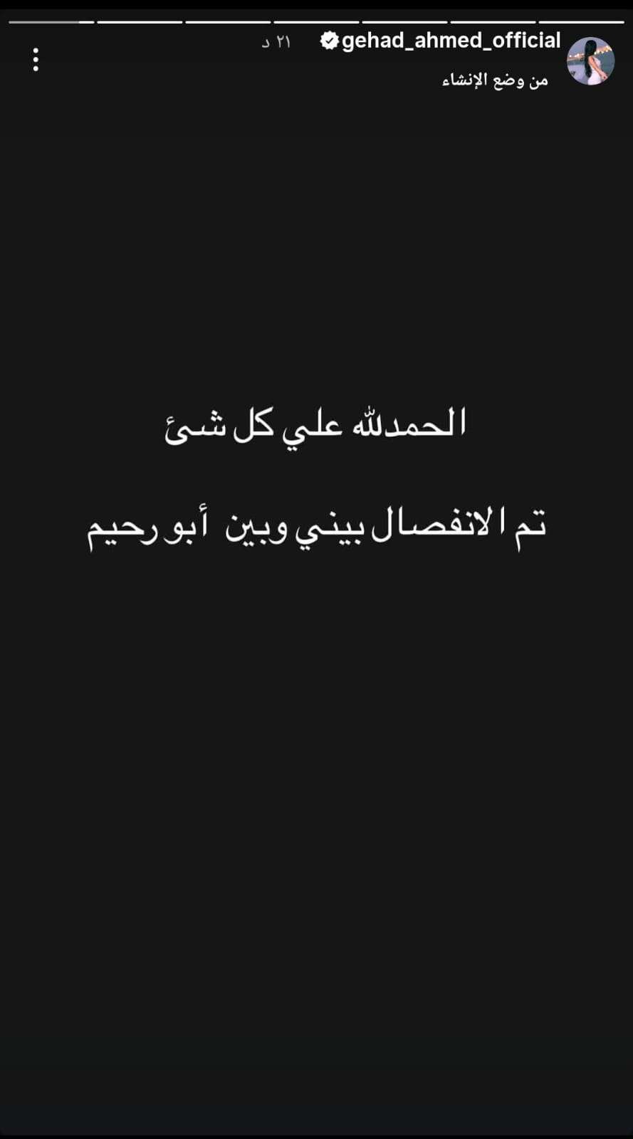 كتبت جهاد عبر خاصية القصص القصيرة على "إنستجرام": "الحمد لله على كل شئ تم الانفصال بيني وبين أبو رحيم".