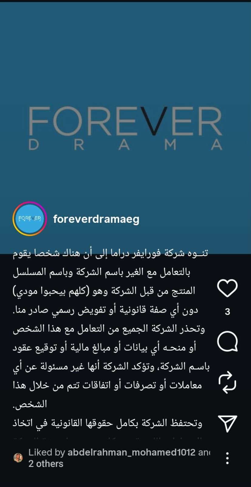 أصدرت نقابة المهن التمثيلية بيانًا رسميًا حذّرت فيه من قيام أحد الأشخاص بانتحال صفة ممثل أو مفوض عن شركة فور إيفر دراما، والتعامل مع جهات وأفراد باسم الشركة وباسم المسلسل الجاري العمل عليه حاليًا “كلهم بيحبوا مودي”، وذلك دون أي صفة قانونية أو تفويض رسمي من الشركة أو أي جهة مهنية معتمدة.