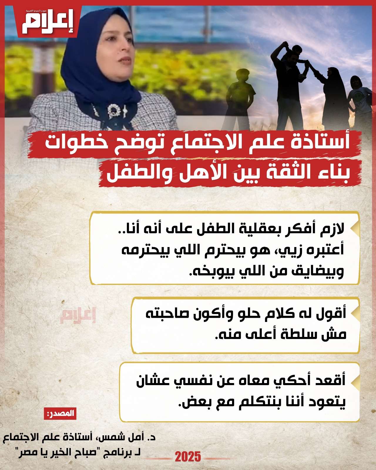 أوضحت الدكتورة أمل شمس، أستاذة علم الاجتماع بكلية التربية جامعة عين شمس، خطوات بناء الثقة بين الطفل وعائلته، ليتمكن من إخبارهم عن كل شيء يحدث معه دون خوف أو تردد.