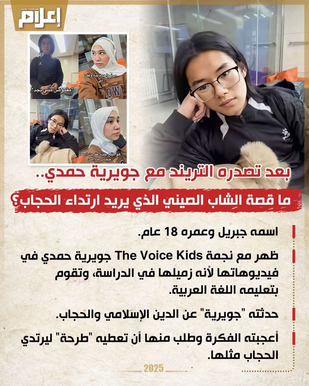 تداول رواد مواقع التواصل الاجتماعي صورة الشاب الصيني "جبريل" الذي يريد ارتداء الحجاب، وذلك بعد ظهوره مع جويرية حمدي، نجمة The Voice Kids، وفيما يلي أبرز المعلومات عنه:
