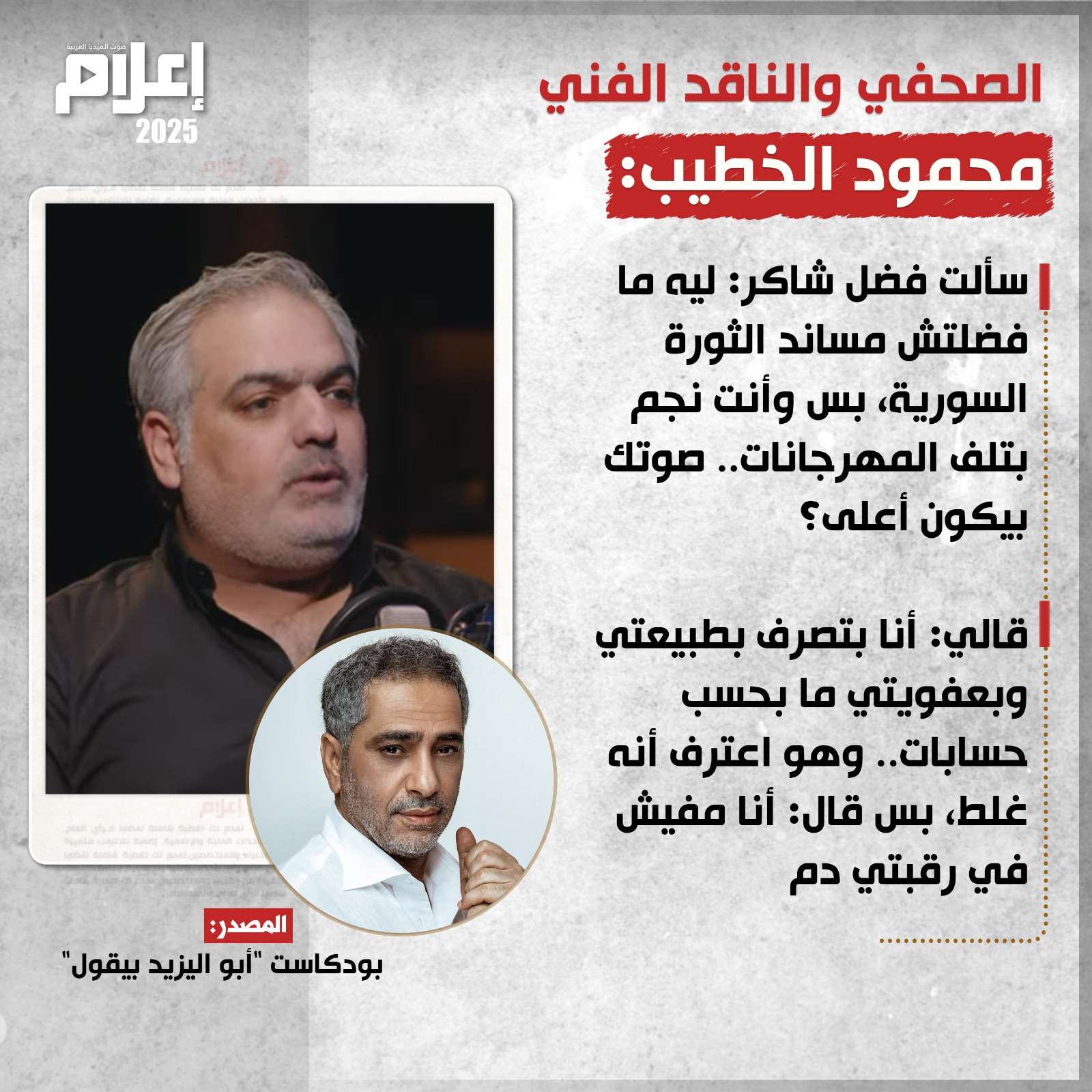 أردف محمود الخطيب: "قضيته سياسية مش فنية، والمحكمة العسكرية اللبنانية في 2018 حكمت ببراءته من قتل الجيش اللبناني والإرهاب.. والعميد عباس إبراهيم والعقيد شامل روكز من الجيش اللبناني يعرفون أن فضل شاكر قبل 10 أيام من معركة (عبرا) انفصل عن جماعة الأسير، لأن كان عندهم نية تحدي الجيش اللبناني، وفضل شاكر رفض، وكثير من القضاء اللبناني قالوا إنه كان بيفضّ الموضوع، ولما برأوه قالوا إنهم مشافهوش في الأحداث".