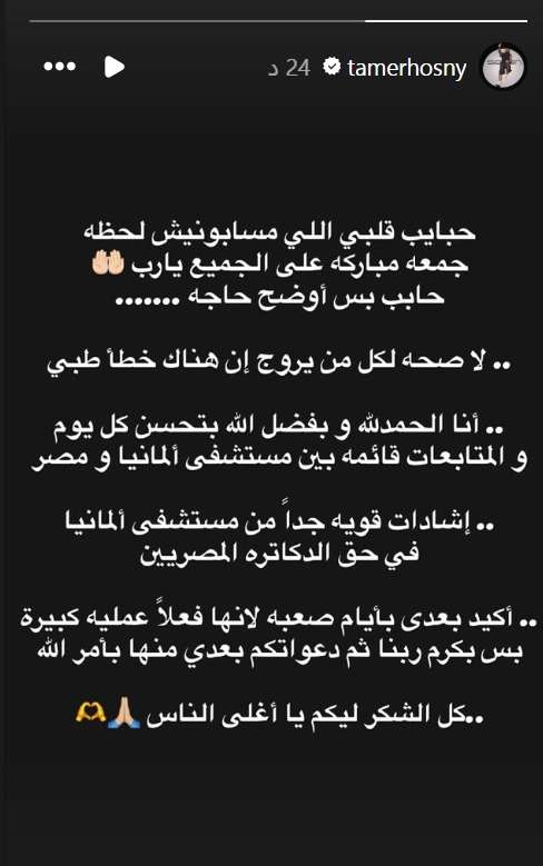 تابع: "إشادات قوية جدًا من مستشفى ألمانيا في حق الدكاترة المصريين.. أكيد بعدّي بأيام صعبة لأنها فعلًا عملية كبيرة، بس بكرم ربنا ثم بدعواتكم هعدّي منها بأمر الله.. كل الشكر ليكم يا أغلى الناس".