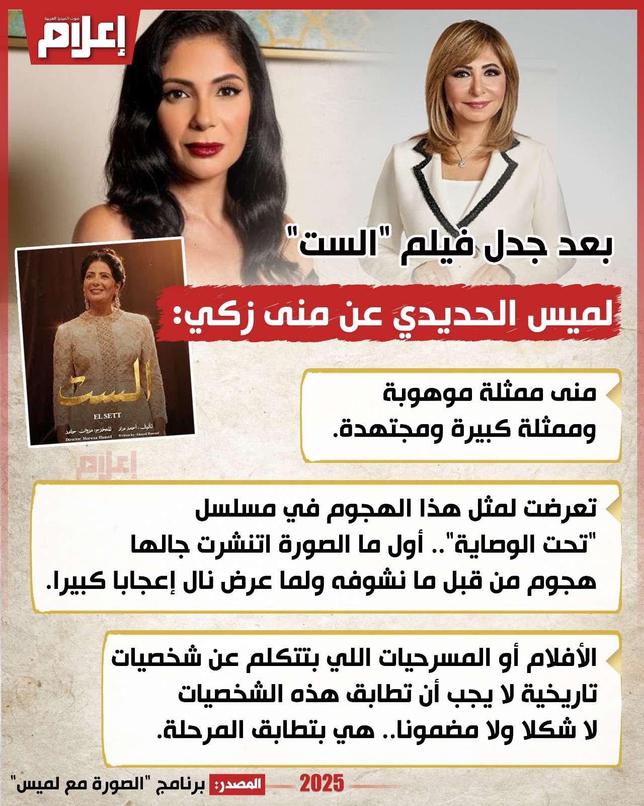 قالت "الحديدي" خلال حلقة مساء السبت من برنامج "الصورة مع لميس": "منى ممثلة موهوبة وممثلة كبيرة ومجتهدة".