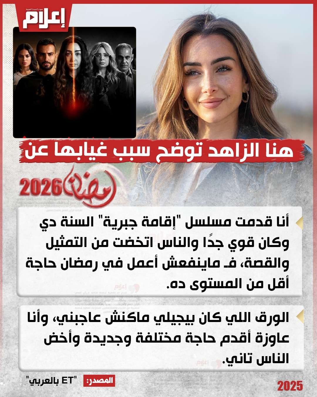 تحدثت الفنانة هنا الزاهد عن سبب غيابها عن موسم رمضان 2026، مشيرة إلى أنها أصبحت أكثر دقة في اختياراتها الفنية بعد النجاح الكبير الذي حققته في مسلسل "إقامة جبرية"، مؤكدة أنها لا تفكر في تقديم أي عمل أقل من المستوى الذي ظهرت به.