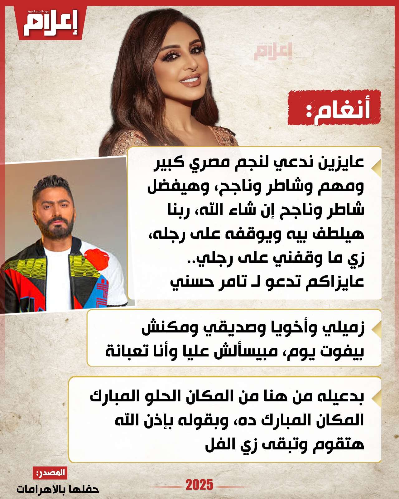 وخلال حفلها الذي أقيم في منطقة الأهرامات، مساء الاثنين، قالت أنغام: "عايزين ندعي لنجم مصري كبير ومهم وشاطر وناجح، وهيفضل شاطر وناجح إن شاء الله. ربنا هيلطف بيه ويوقفه على رجله زي ما وقفني على رجلي.. عايزاكم تدعو لتامر حسني".